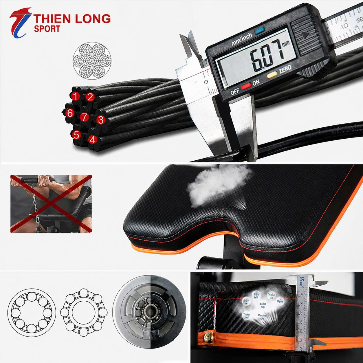 - Mặt yên ghế và bàn tập tay được làm từ cao su non dày 5cm, bên ngoài bọc da PU cao cấp mang đến sự êm ái, thoải mái cho người tập.